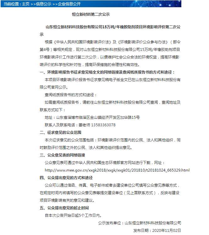 我公司的公眾參與公告于2020年11月2日—11月6日在山東恒立新材料科技股份有限公司網站:http://m.duanjixiang888.cn/gongshi/qiyexxgg/show287.html進行了網絡公示,其符合《環境影響評價公眾參與辦法》(生態環境部令 部令 2018年第4號)的要求。網站公示截圖如下:
